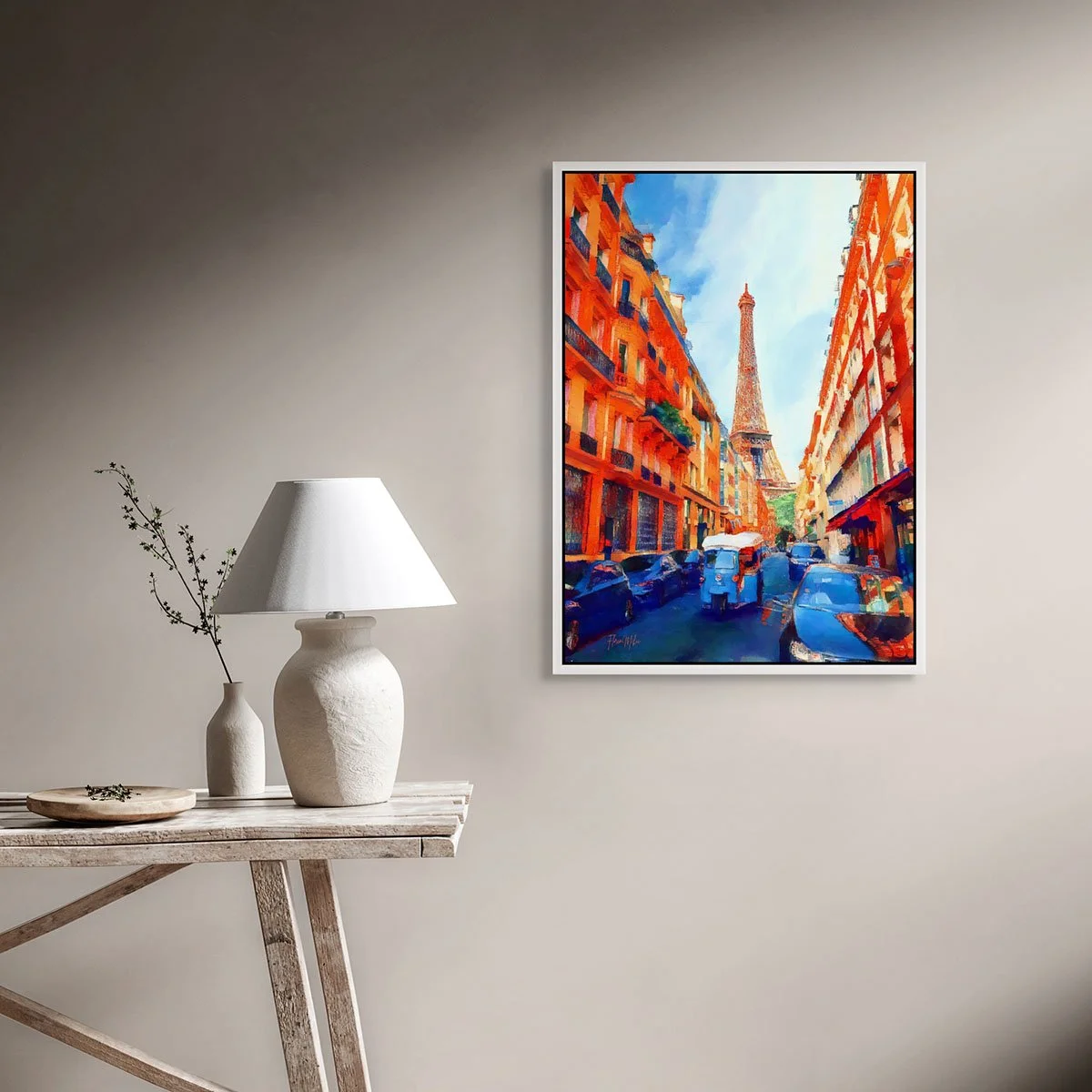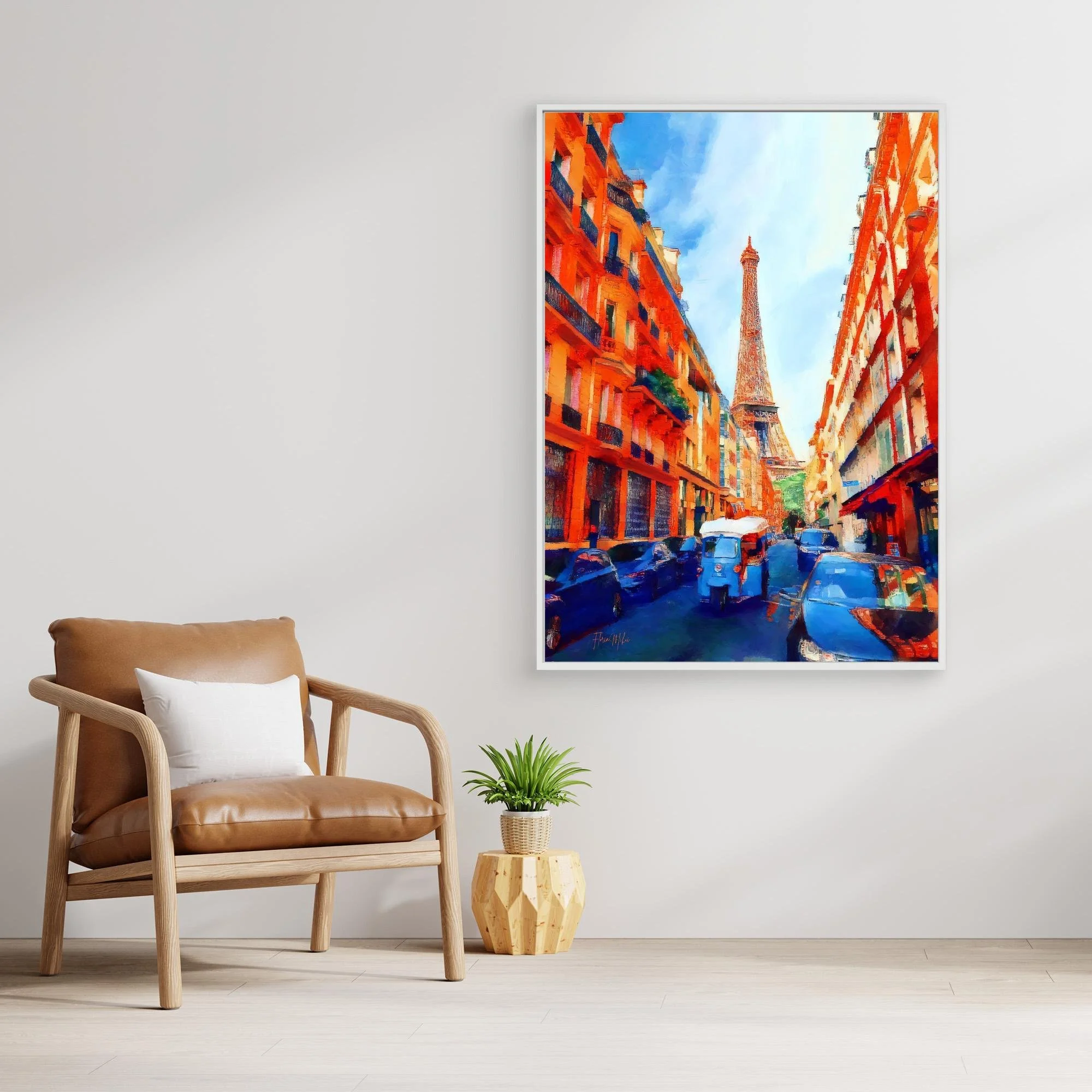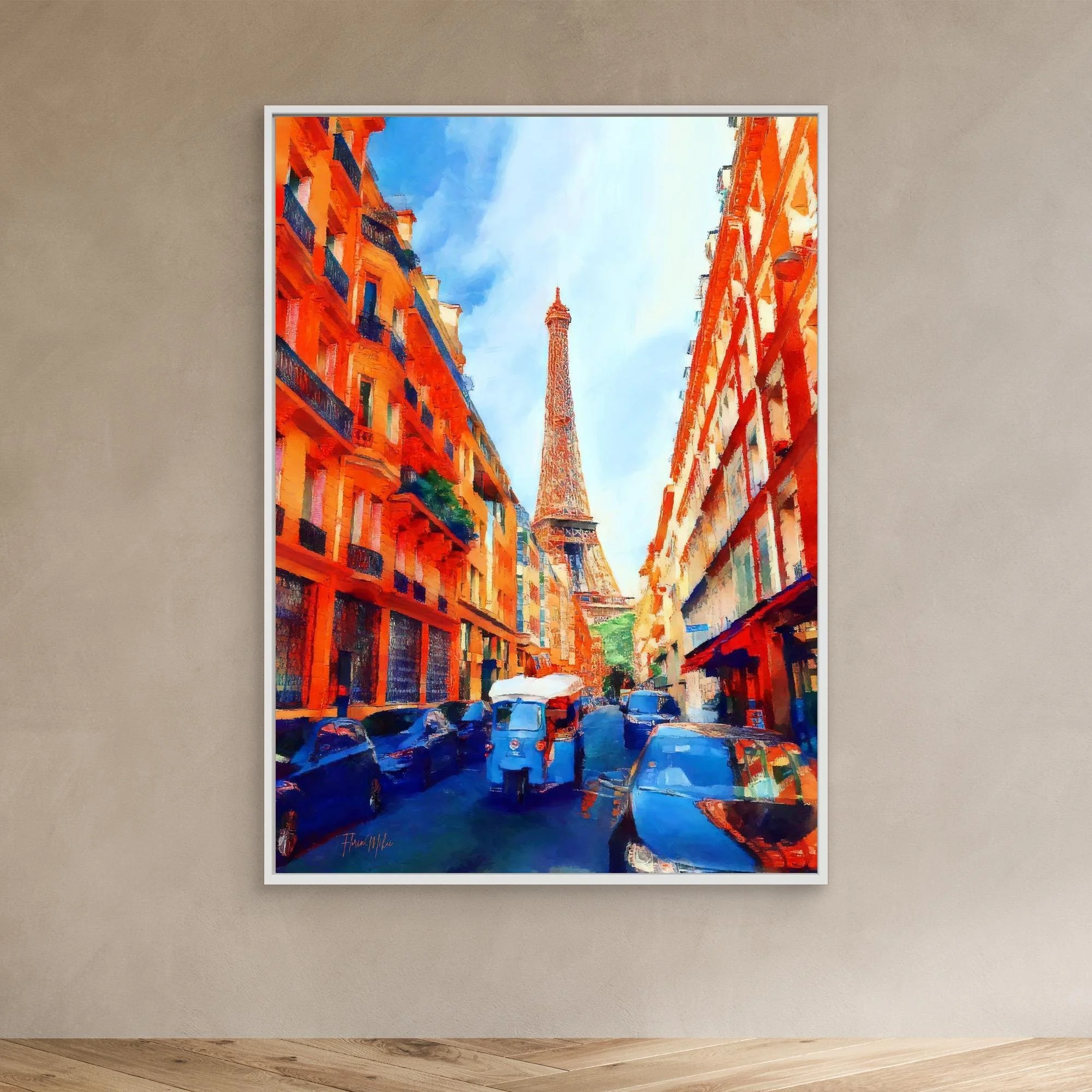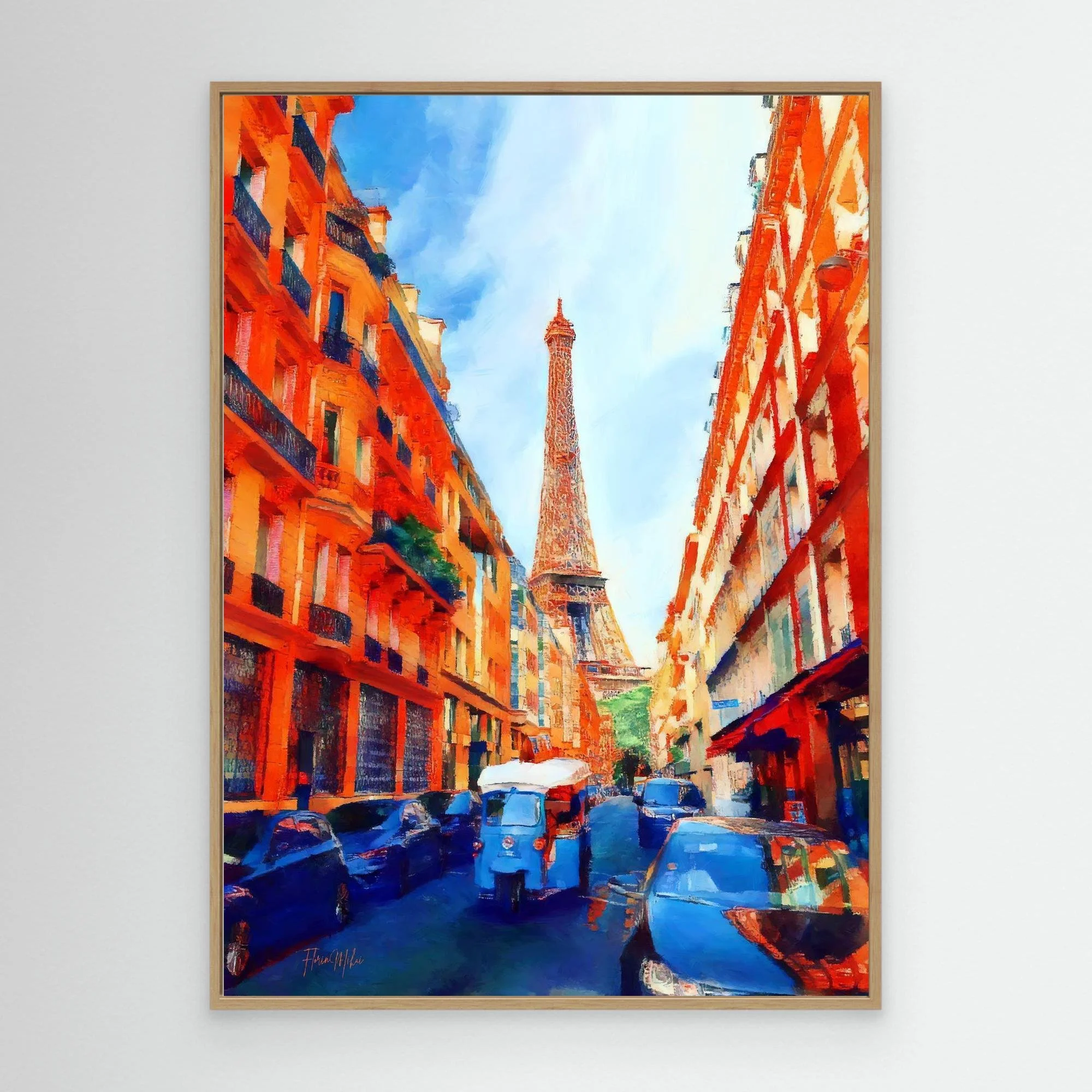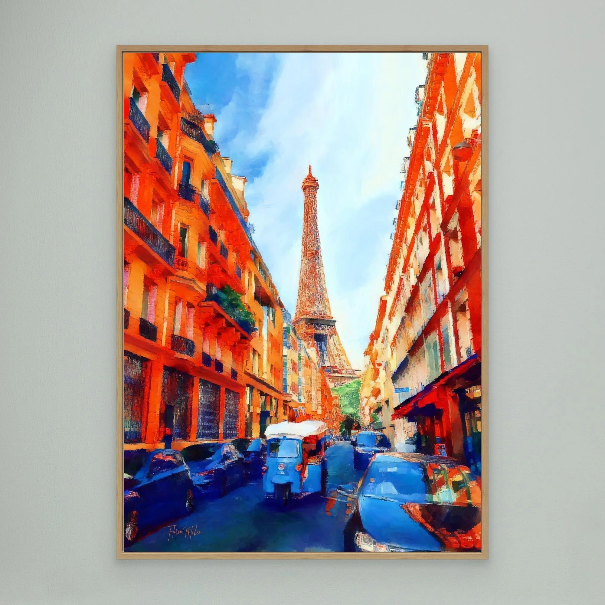This fine art print captures the Eiffel Tower at sunset, framed by charming Parisian streets glowing with golden light. A timeless Paris cityscape artwork that adds warmth, elegance, and travel-inspired beauty to any interior.